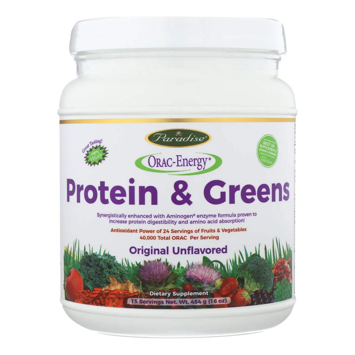 Transform your daily nutrition routine with this exceptional protein and greens powder blend. Packed with the antioxidant power equivalent to over 24 servings of fruits and vegetables, this dietary supplement offers a robust 20 grams of protein per serving. Enjoy its delightful taste in apple juice or fruit smoothies for a truly satisfying experience.